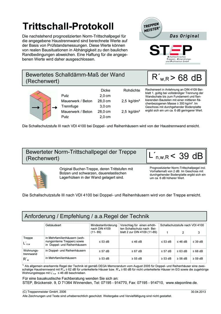 • Lassen Sie sich von Ihrem Treppenlieferanten nachweisen, welchen Trittschall Sie aufgrund der in Ihrem Haus vorgesehenen Trennwände erzielen werden zum Beispiel durch ein Trittschallprotokoll.